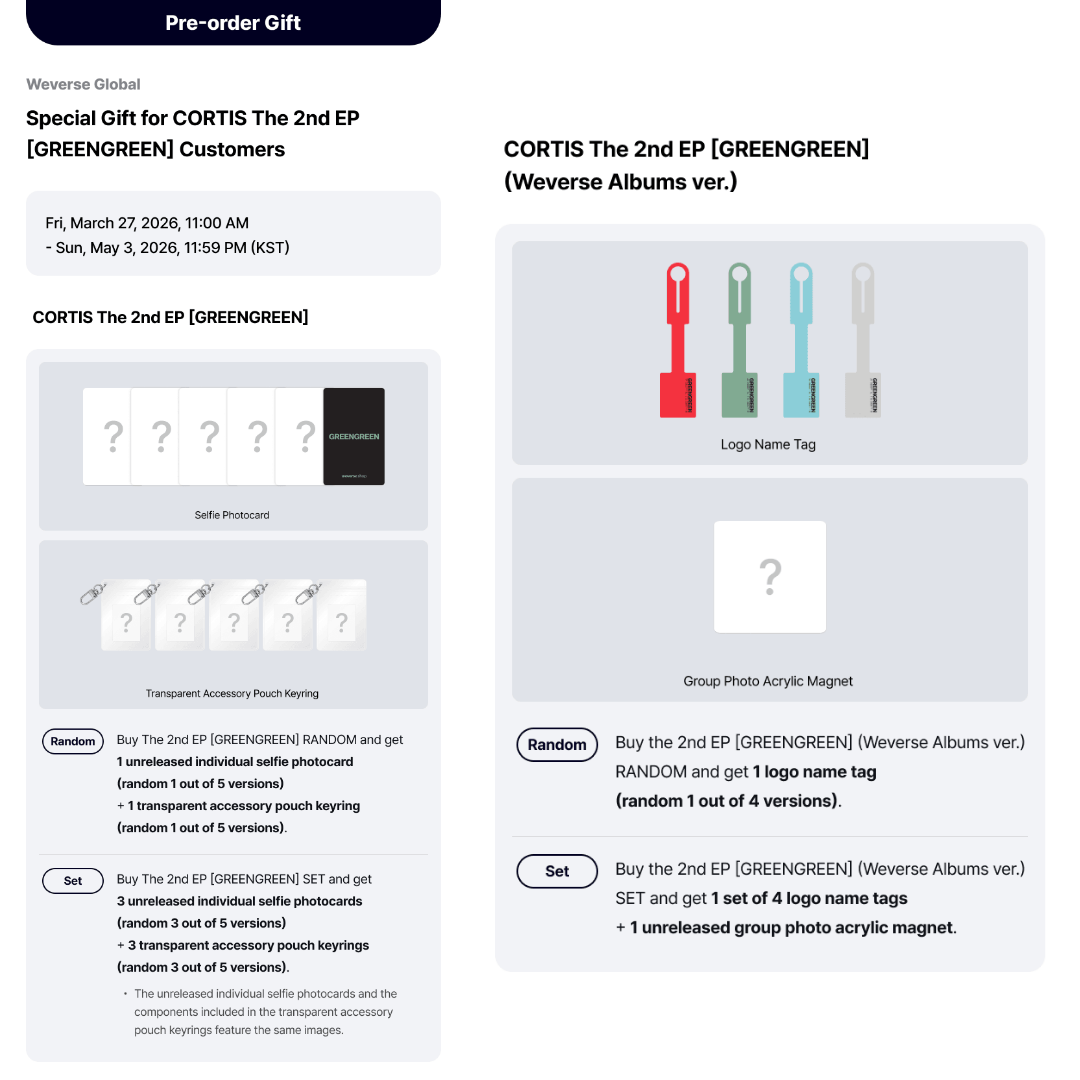 - Random 3 out of 5 unreleased individual selfie photocard + Random 3 out of 5 transparent accessory pouch keyrings + Random 1 out of 5 unreleased selfie photocard ('GREENGREEN' Released Party)